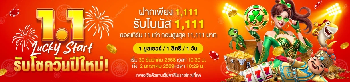 1.1 Lucky Start รับโชควันปีใหม่!  ฝากเพียง 1,111 บาท รับโบนัสอีก 1,111 บาท! โบนัสพิเศษมอบให้เฉพาะสมาชิกเทพเอเชีย ยอดเทิร์นโอเวอร์เพียง 11 เท่า ถอนได้สูงสุด 11,111 บาท สมาชิก 1 ยูสเซอร์ รับ 1 สิทธิ์ต่อ 1 วัน เฉพาะเกมสล็อตและยิงปลาจีคลับ