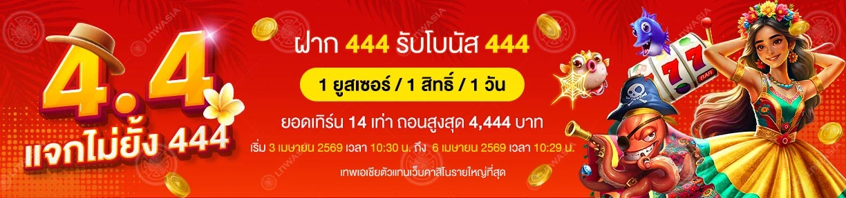 สนุกกับโบนัสพิเศษที่ให้เฉพาะสมาชิกเทพเอเชีย เพียงฝาก 444 บาท รับโบนัส 444 บาท ถอนได้สูงสุด 4,444 บาท เทิร์นโอเวอร์ 14 เท่า สมาชิก 1 ยูสเซอร์ รับ 1 สิทธิ์ต่อ 1 วัน เฉพาะเกมสล็อตและยิงปลาจีคลับ